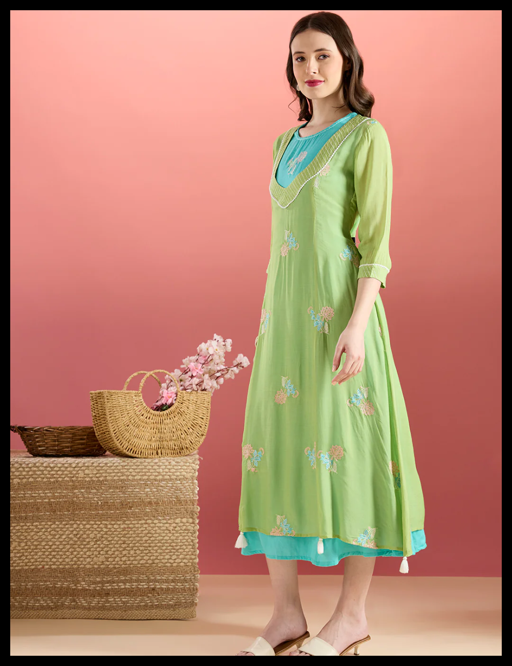 Smocked Tie and Dye Dress with Ethnic Jacket - Lime green