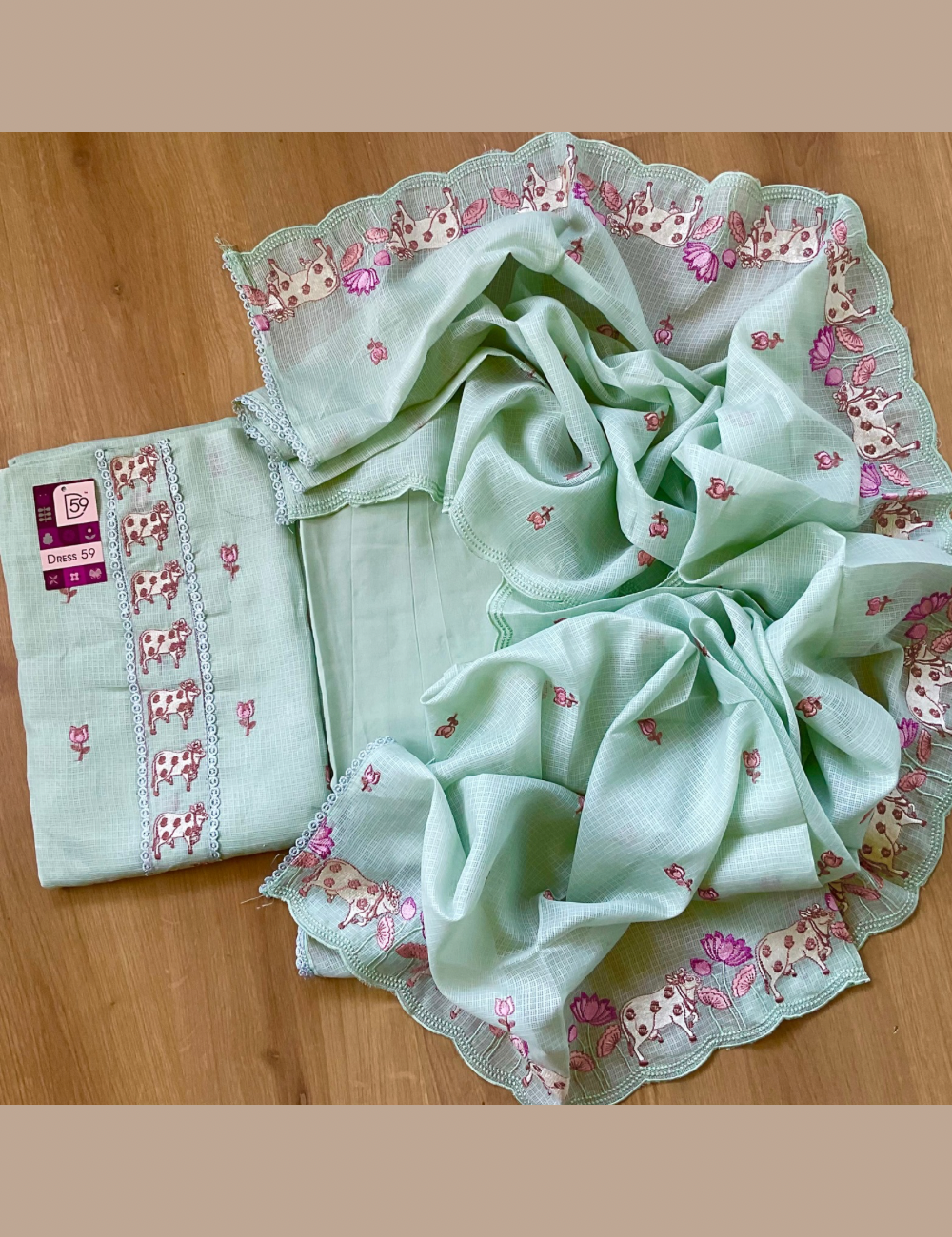 Color: Pastel green Type: Unstitched Style: pitchwai concept Top Fabric: Soft kota cotton, with pretty Pitchwai...