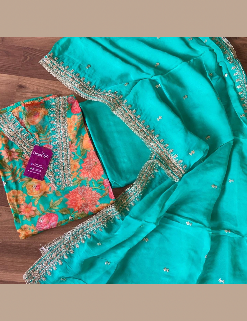 Soft Organza Floral Printed Designer Semi Stitched Salwar - Turquoise Green
