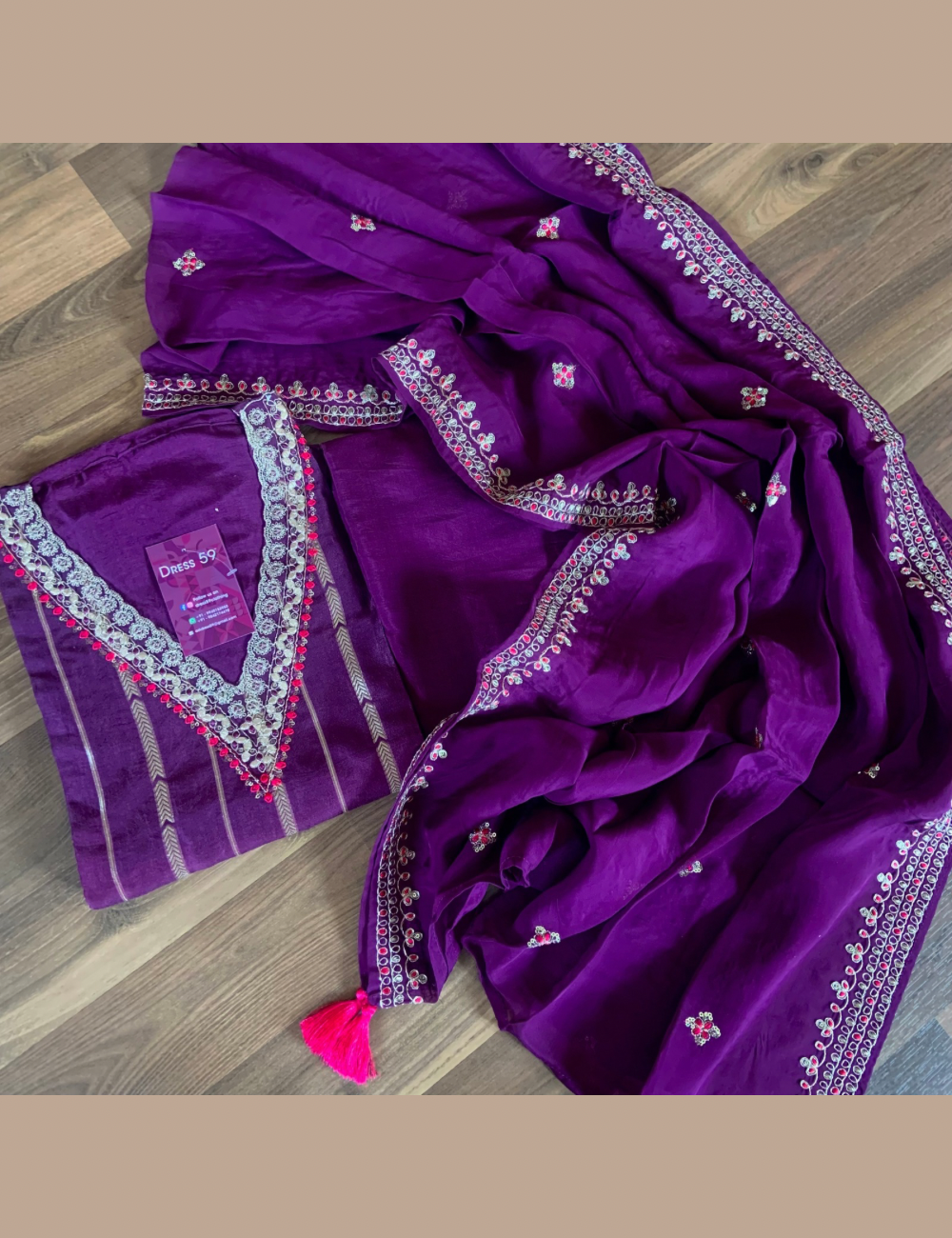 Colour: Dark Purple, Reddish PinkType: Unstitched Style: Party Wear Fabric: Top - Muslin Silk, Beautifully Embroidered Neck...