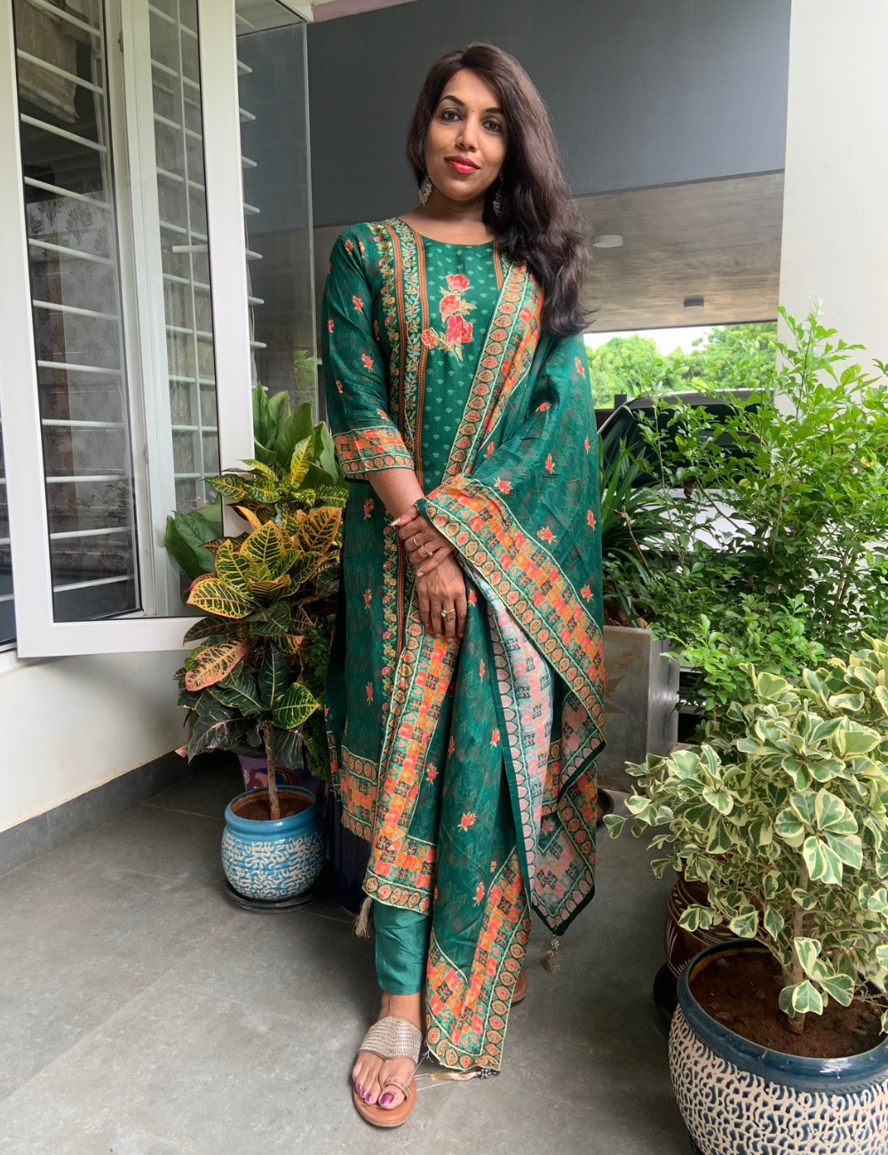 Colour: bottle green Type: stitched Style: floral prints Fabric - Top - soft muslin silk...