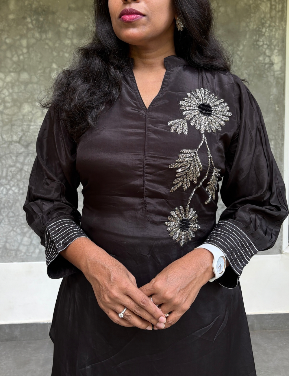 - Top Fabric: Soft gaji silk | A-line silhouette with asymmetric cut | Elegant floral embellishments on the left side | Comes with sleeves