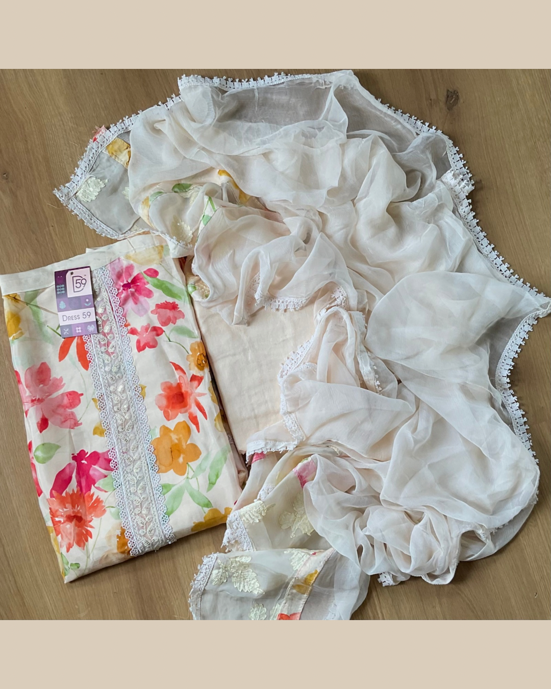 Floral Muslin Silk Designer Unstitched Salwar - Off White