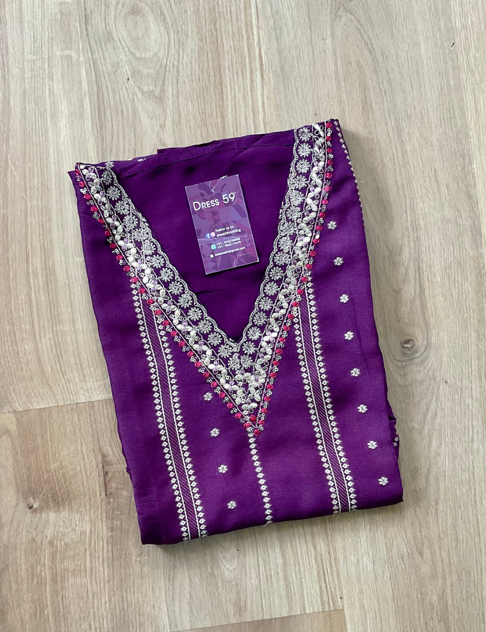 Fabric - Top - Soft silk, trending v neck, gold stripes all over the top, beautifully embroidered the v neck