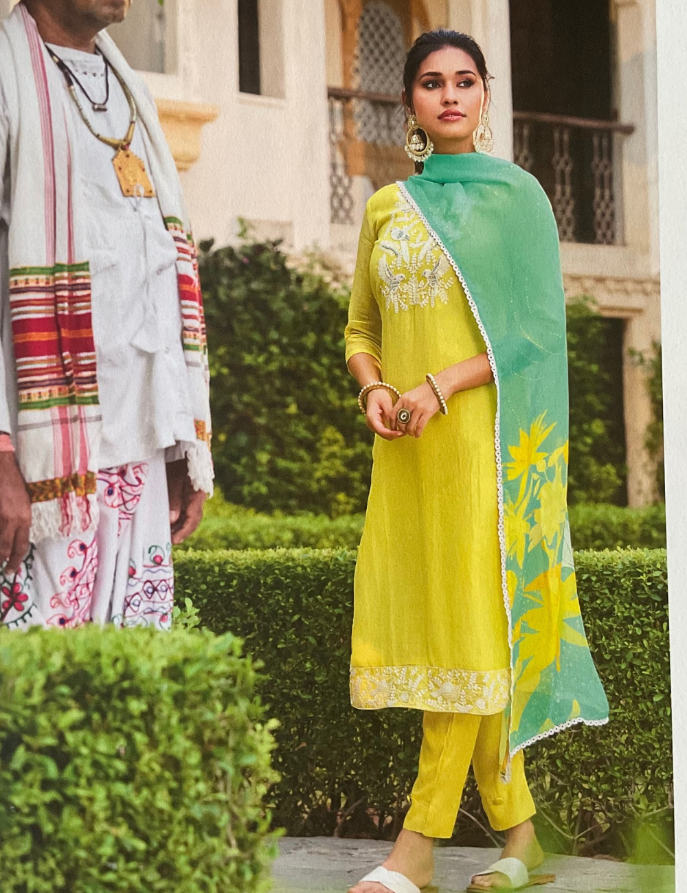 ✨ A graceful lemon yellow muslin silk designer set with intricate embroidery and a statement floral dupatta — perfect for festive occasions and elegant gatherings.
