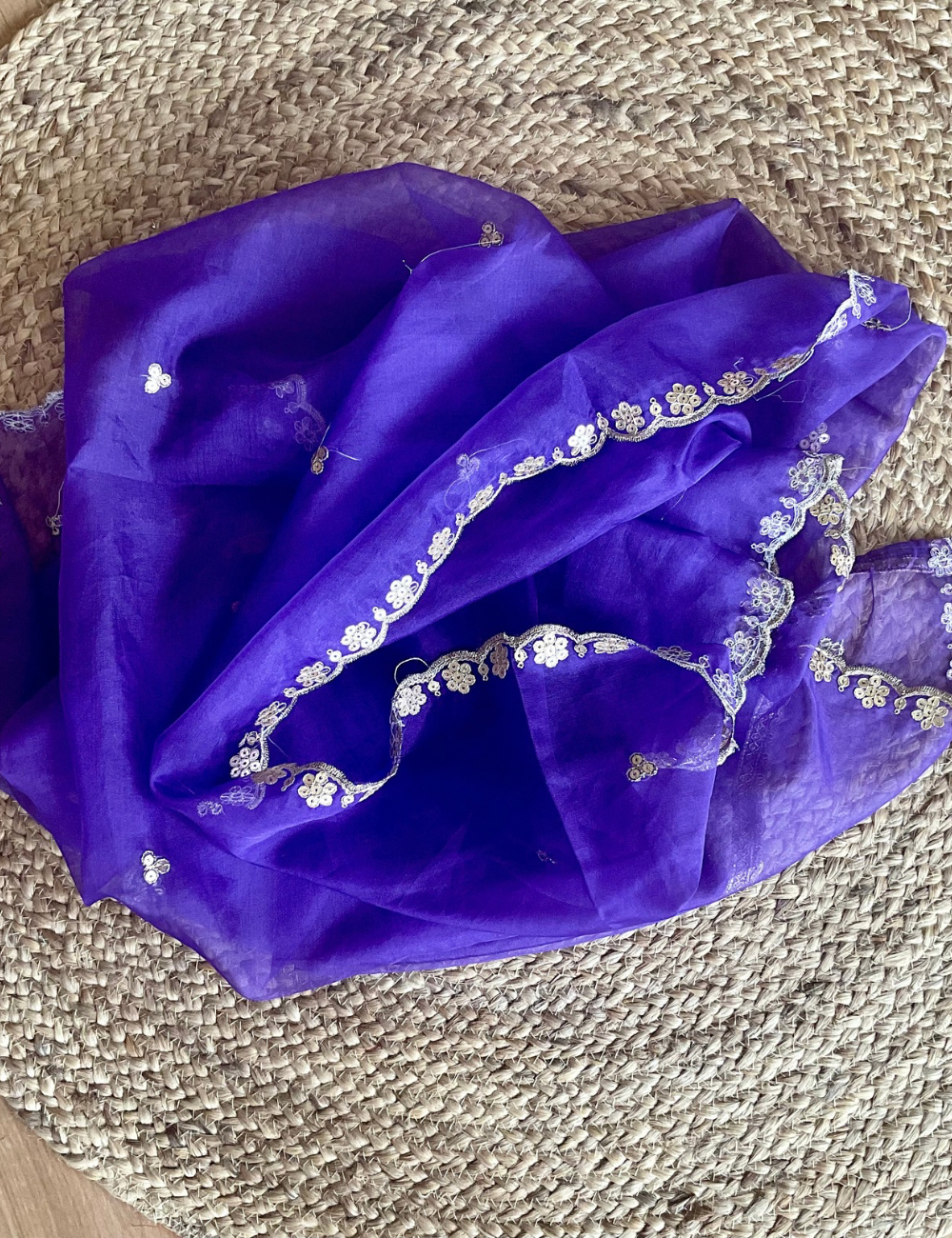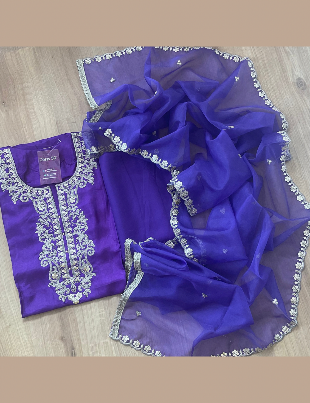 Fabric: Top - Muslin Silk, Beautifully Embroidered Neck and Yoke; Bottom - Muslin; Dupatta - Organza, with Bright Gold Borders