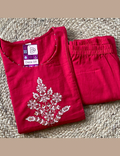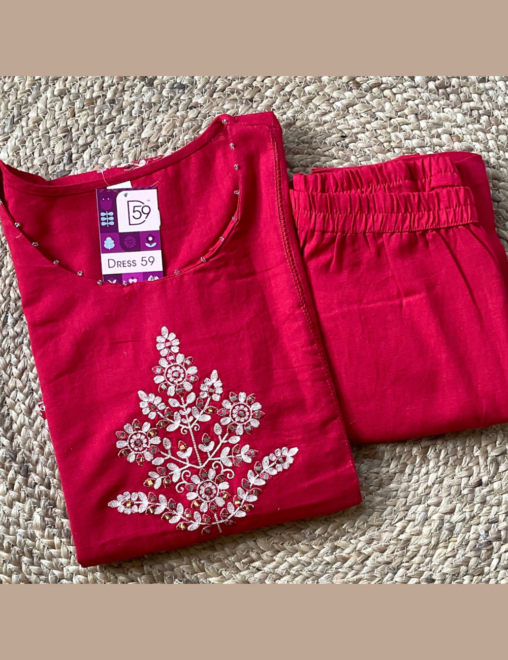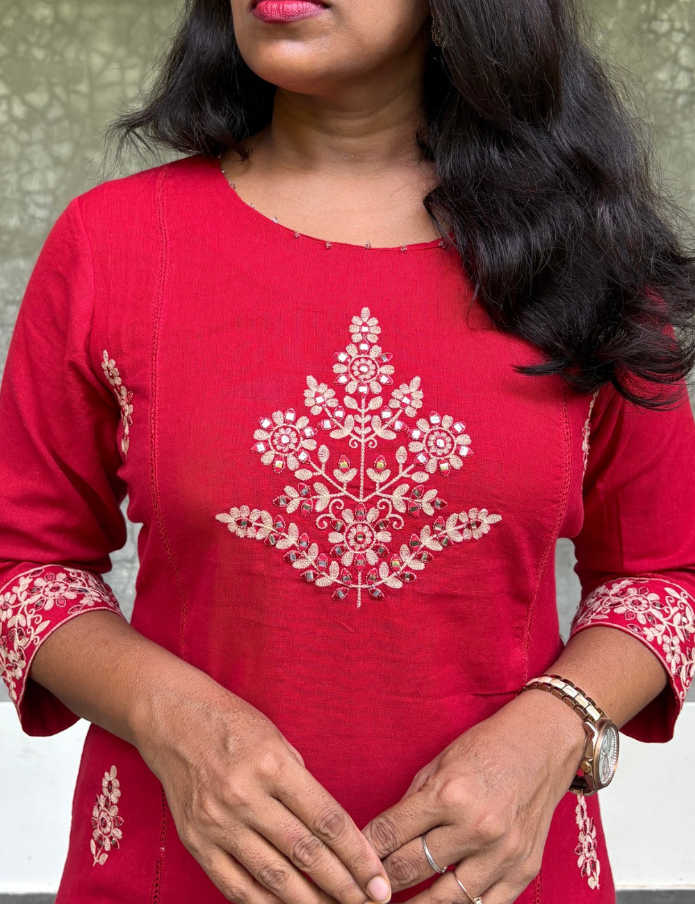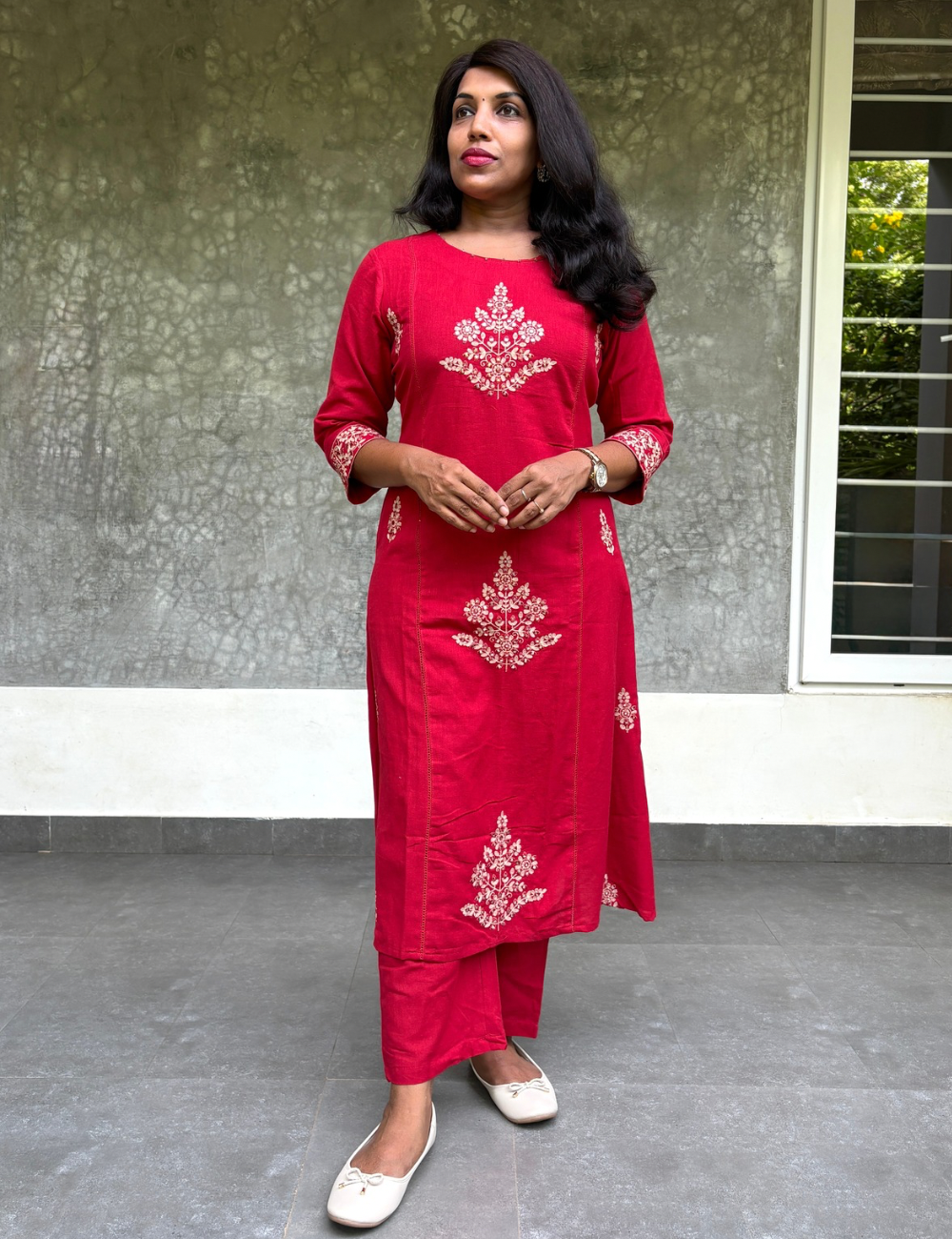 ✨ A stylish red cotton co-ord set with delicate floral handwork and pearl accents — perfect for both office wear and everyday chic looks.