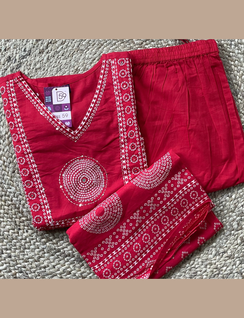 - Top Fabric: Bandhani printed cotton | Straight-cut top with beautiful bandhani patchwork | ¾ sleeves