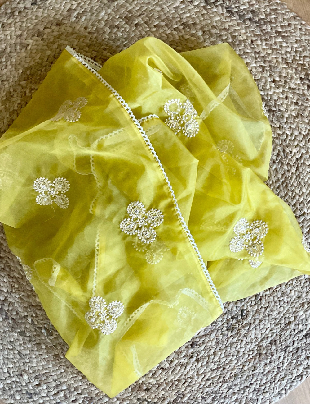 Fabric: Top - Muslin Silk, Pretty Embroidery Work on the Yoke; Bottom - Muslin; Dupatta - Organza, with Cute Embroidery Work