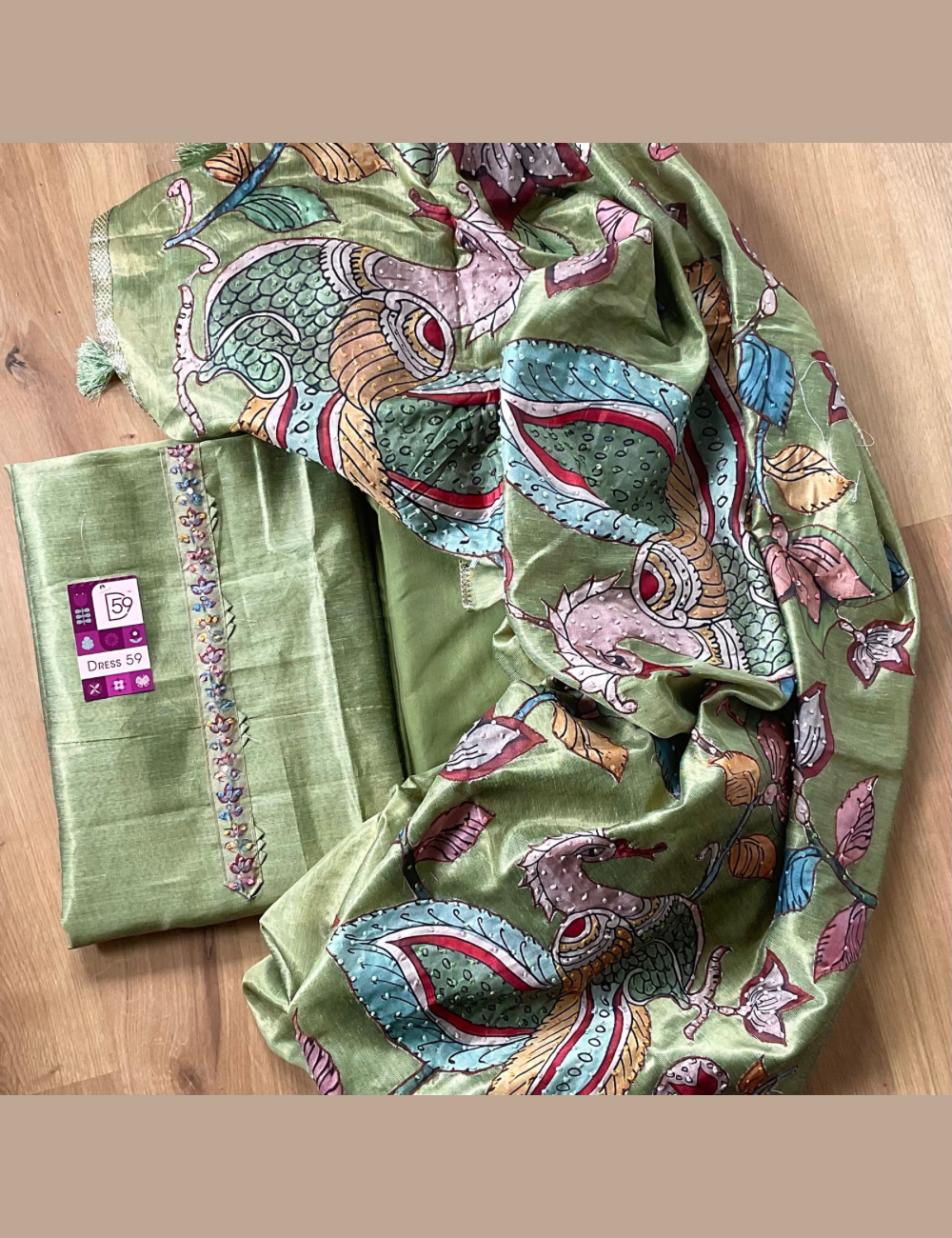 ✨ A gorgeous festive set blending luxurious tissue silk with artisanal pen Kalamkari work — perfect for Diwali, pujas, and traditional occasions.