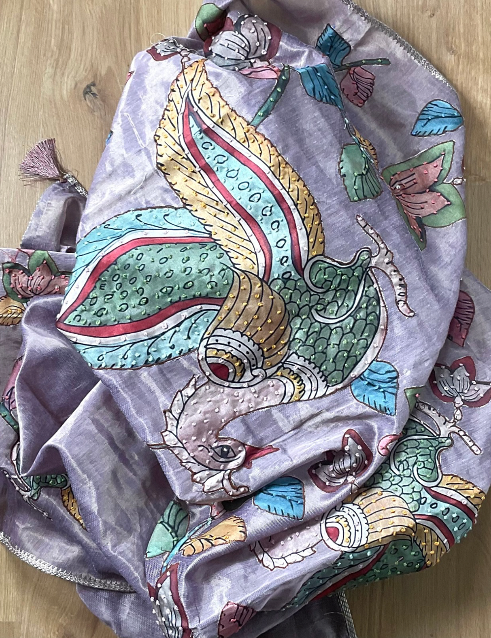 - Dupatta: Gorgeous Pen Kalamkari Dupatta with Patchwork & French Knot Detailing, Tissue Silk Patchwork + Hand Kalamkari Work All Over