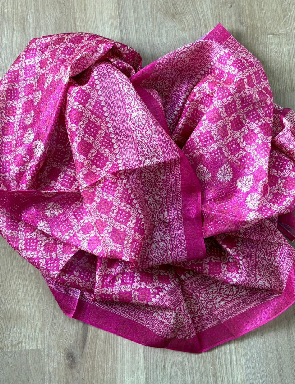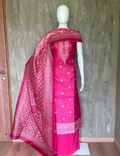 ✨ A graceful Rani Pink Semi Tussar Silk Suit with elegant ethnic prints — perfect for weddings, festive functions, and temple wear.