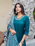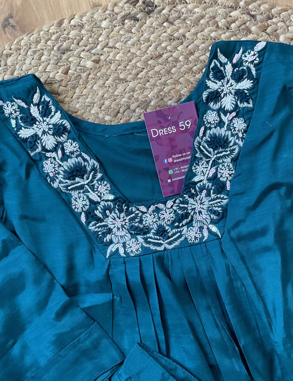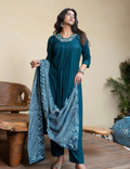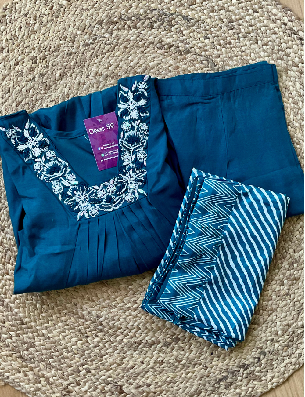 Soft Muslin Silk Pleated Aline Kurta Set - Teal Blue